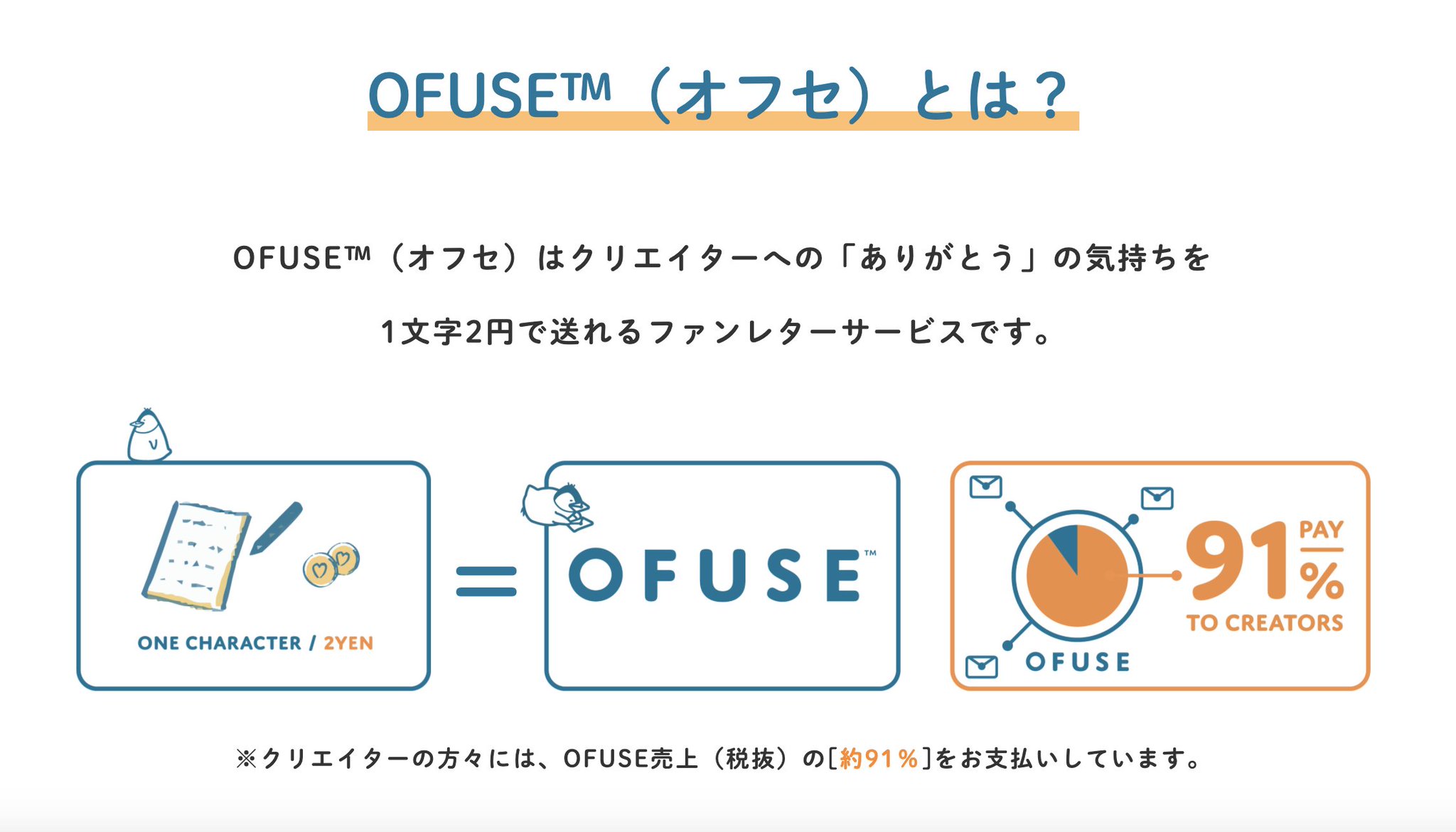 Ofuse オフセ 運営 A Twitter ペンッ 改めまして Ofuse オフセ は クリエイターへの ありがとう の気持ちを1文字2円で送れるファンレターサービスです クリエイターの皆様に Ofuse売上 税抜 の 約91 をお支払いしています Ofuse Https T Co